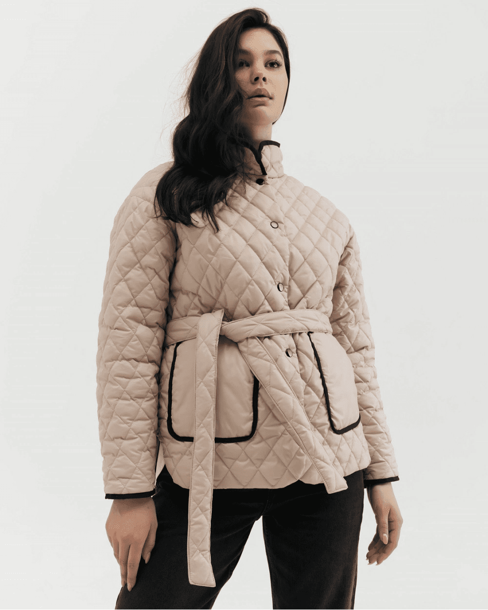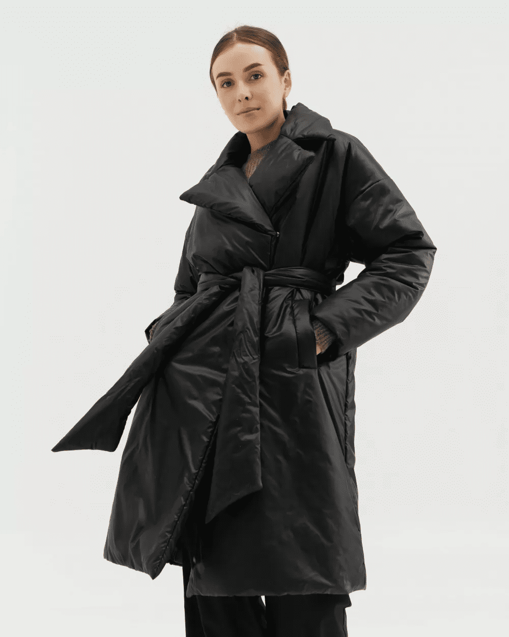 Стеганое пальто свободного кроя без воротника с длинными рукавами. Застёгивается на пуговицы. Два боковых кармана спереди и пояс в комплекте для подчеркивания талии. Пальто утепленное Hollowsoft 150, хорошо адаптированное под дождь и ветер, не утяжеляет изделие. Рекомендуемый температурный режим: +5 – +15 °С. Этот вариант отлично подходит для осени и весны, а иногда и для теплых зимних дней. Оно мягкое и приятное на ощупь, легкое и стильное.